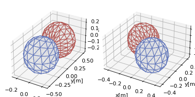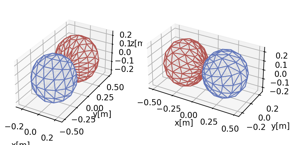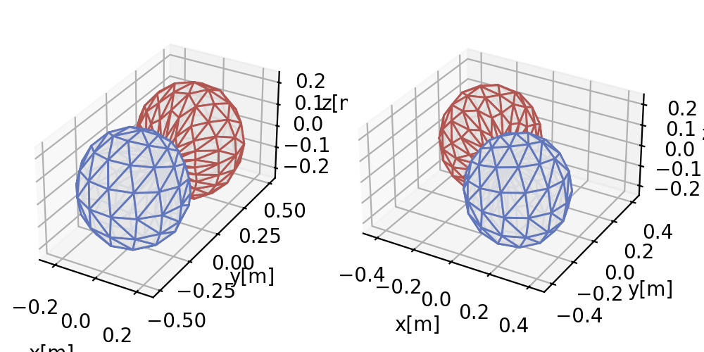 >>> sampling = spharpy.samplings.equal_area(0, n_points=250) >>> Y = spharpy.SphericalHarmonics.from_definition( >>> definition, coordinates=sampling) ... >>> _, axs = plt.subplots( >>> 1, 2, subplot_kw={'projection': '3d'}, figsize=(5, 2.5), >>> layout='constrained') >>> spharpy.plot.balloon_wireframe( >>> sampling, Y.basis @ coefficients, ax=axs[0], colorbar=False) >>> spharpy.plot.balloon_wireframe( >>> sampling, Y.basis @ rotated_coefficients, ax=axs[1], >>> colorbar=False)